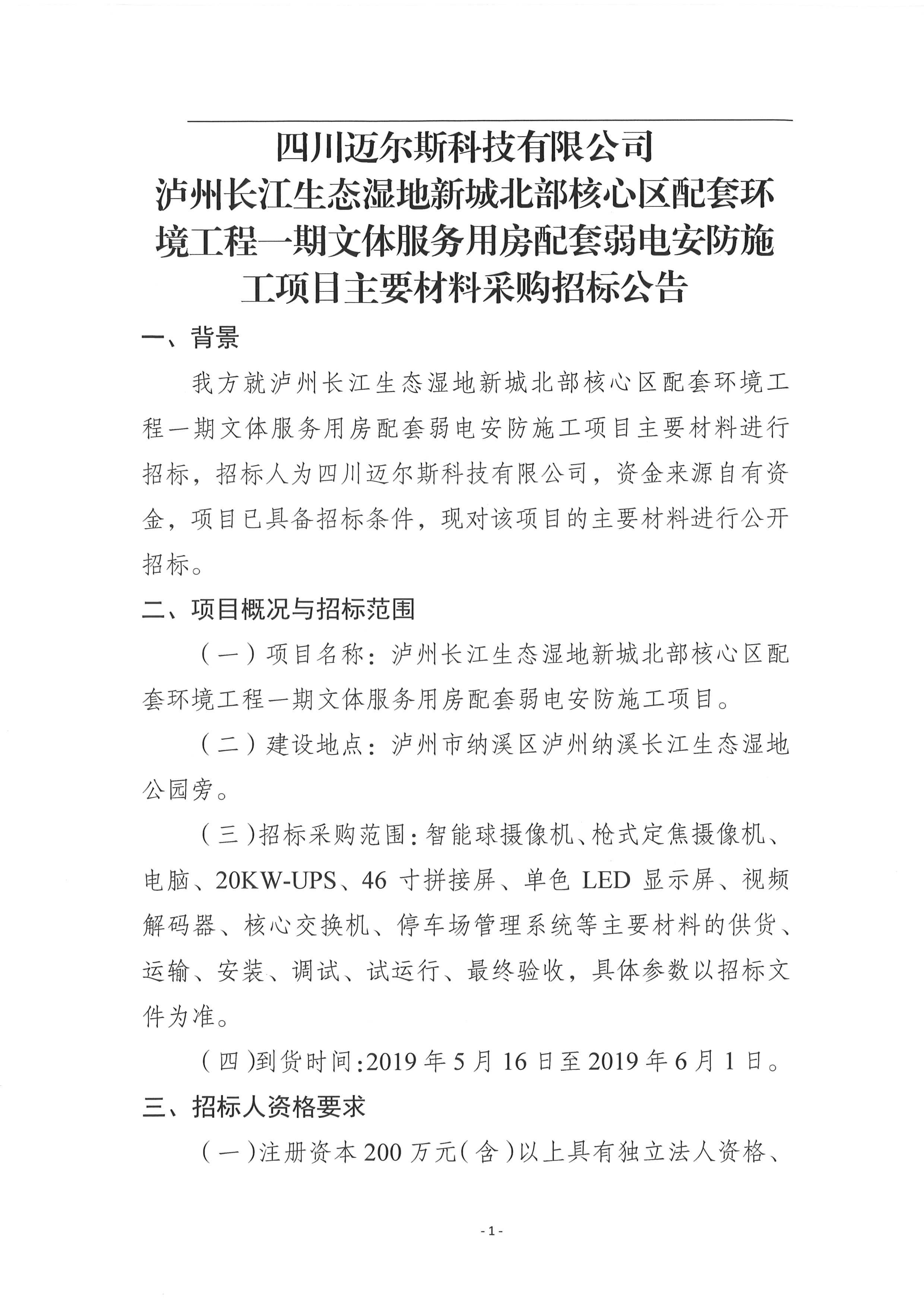 瀘州長江生態(tài)濕地新城北部核心區(qū)配套環(huán)境工程一期文體服務用房項目配套弱電安防施工項目主要材料采購招標公告